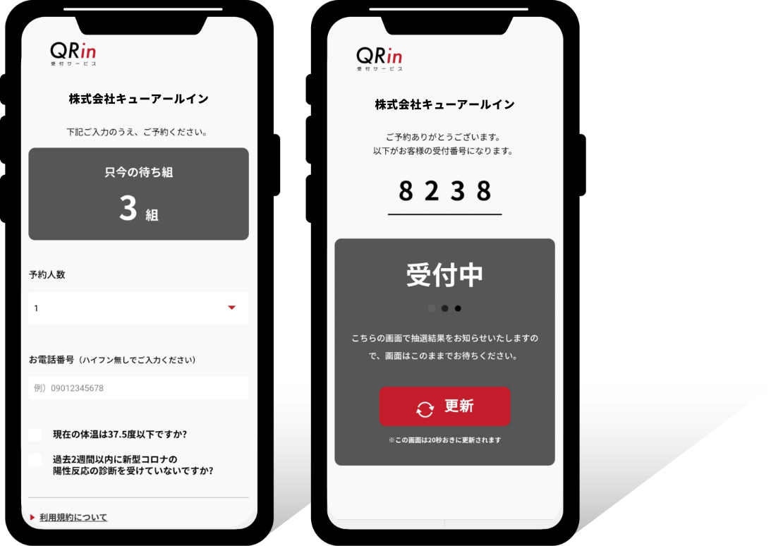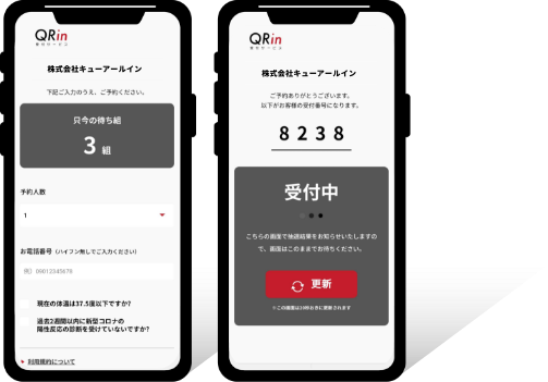 現在の待ち人数・予約人数・ご連絡先・体温の確認・感染症の有無の確認ができる受付フォームです。受付が完了すると、受付中画面に切り替わります。