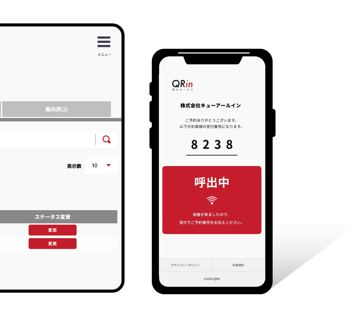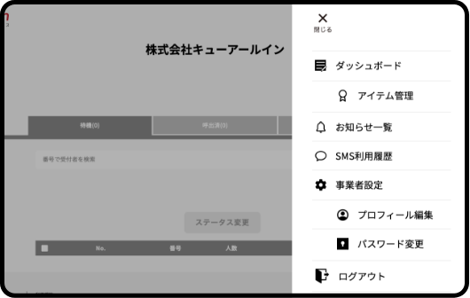 アイテムページの待機タブからステータスを呼出済に変更すると、お客様のスマホのブラウザがお呼び出し画面に変わります。