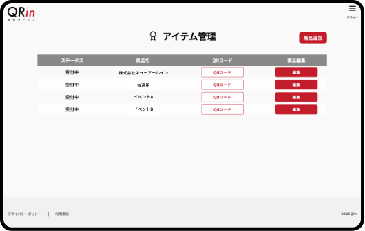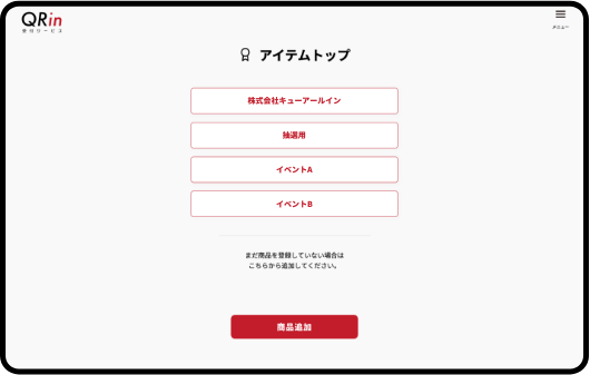 メニューのアイテム管理から使用したいアイテムのQRコードを選択するだけ。自動でQRコードを発行します。万が一の顧客リストも自動で収集。